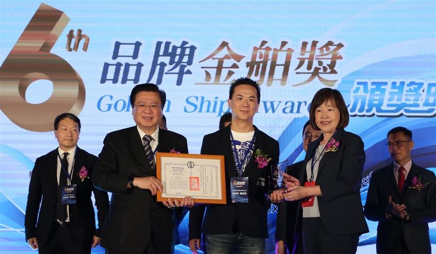 亞家生技獲品牌金舶獎,創辦人吳坤烈(前排中)從商總理事長許舒博(前排左)與國發會副主委高仙桂(前排右)手中,接下獎狀及獎座。(資料來源:中華民國全國商業總會)
