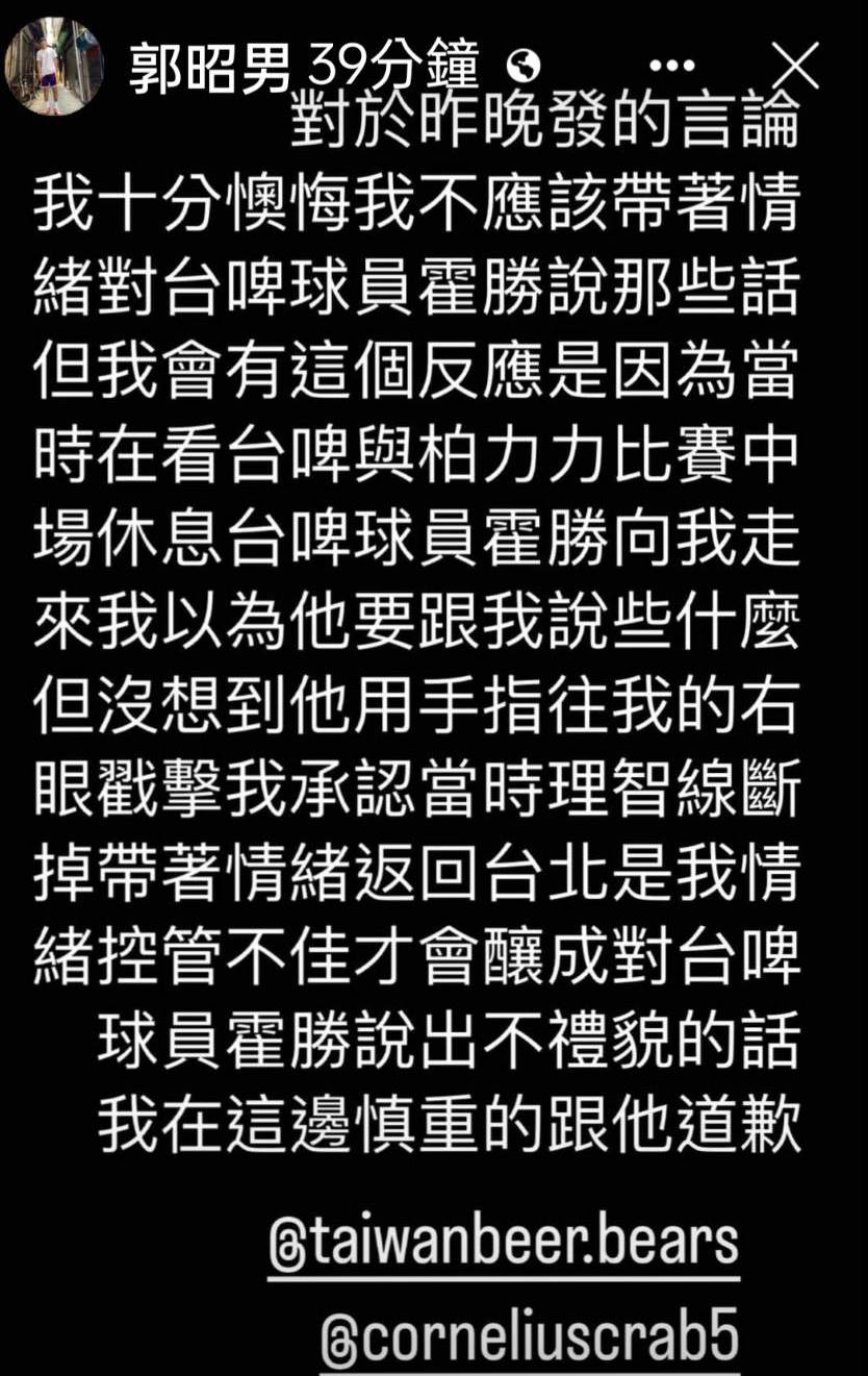 這讓網友看見後上傳到批踢踢,引發鄉民討論,今(21)日郭昭男也發出道歉文,寫下「對於昨晚發的言論我十分懊悔,我不應該帶著情緒對台啤球員霍勝說那些話,但我會有這個反應是因為,當時在看台啤與柏力力比賽(週日),中場休息台啤球員霍勝向我走來,我以為他要跟我說些什麼,但沒想到他用手指往我的右眼戳擊,我承認當時理智線斷掉帶著情緒返回台北,是我情緒控管不佳,才會釀成對台啤球員霍勝說出不禮貌的話,我在這邊慎重的跟他道歉。」