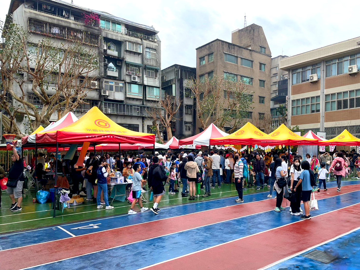 台北市中正區河堤國小則以「樂聲悠揚樂園遊,歡聲喜鼓迎佳節」為主題,有二手商品、手工藝品販售,益智活動闖關等眾多攤位,表演節目方面,除了直笛隊、舞蹈校隊外,還有邀請中正國中國樂團演出,有5位校友返回母校演出,當天現場民眾都相當的興奮。