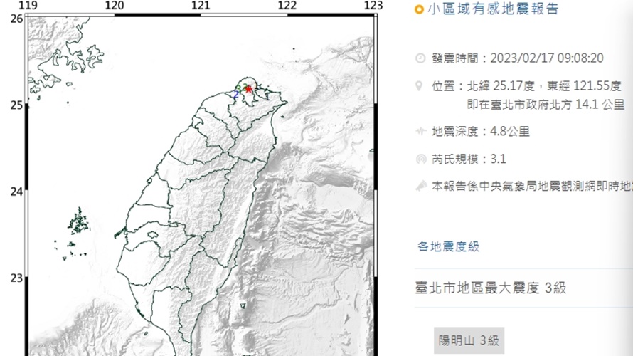 北投出現罕見地震。(圖/取自中央氣象局臉書)