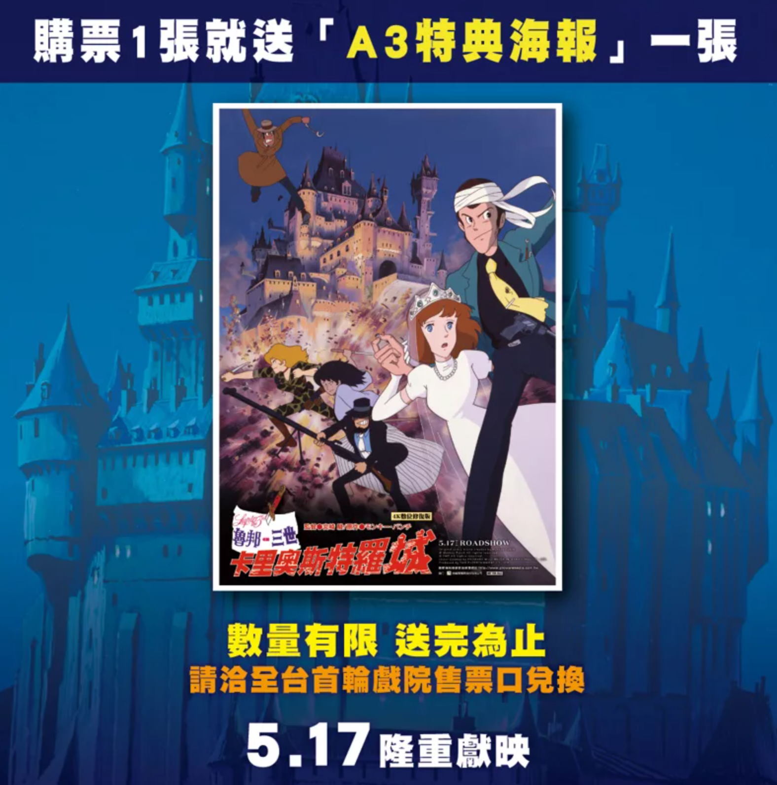《魯邦三世 卡里奧斯特羅城》4K數位修復版將於5月17日起在全台威秀影城盛大上映。凡購票觀影者均可獲得精美A3特典海報一張,各戲院贈送數量有限,送完即止。喜愛宮崎駿導演作品的影迷們,切勿錯過這次難得的機會!