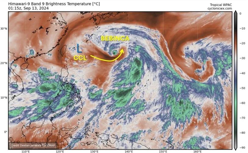 貝碧佳颱風捲入了冷心低壓外圍的乾空氣,結構大幅度轉差。(圖/摘自「天氣職人-吳聖宇」臉書粉專)
