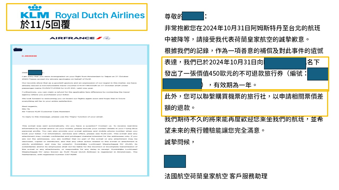 ▲荷蘭航空於11/5回覆的信件,只補償450元歐元的不可退款旅遊券。(圖/投訴者提供)