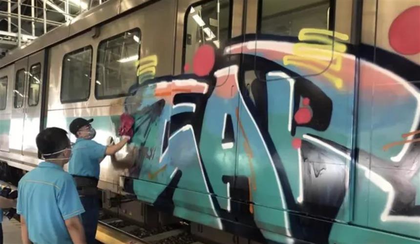 近年高雄市違法塗鴉事件頻傳,去年8月發生高捷列車機廠遭人半夜闖入,在2輛列車車身上塗上大片塗鴉,高捷事後動員27人次,花6小時才將塗鴉清除。(圖/高雄捷運提供)