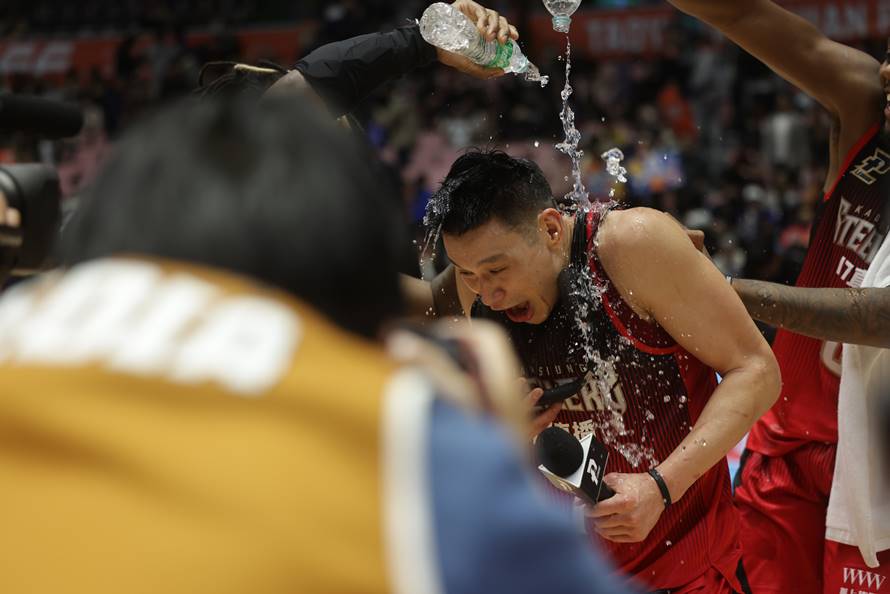 ▲林書豪賽後被慶祝淋水。(圖/高雄鋼鐵人提供)