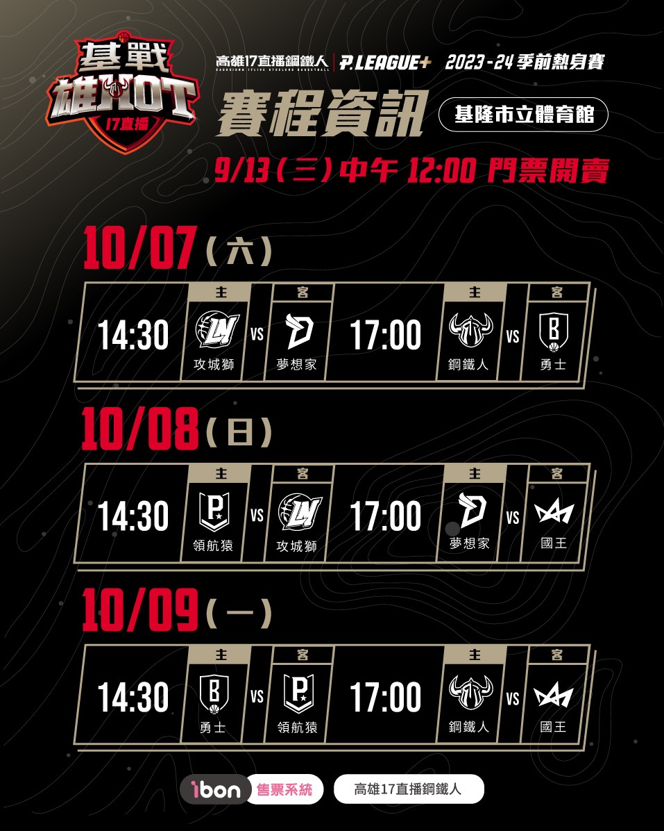 P. LEAGUE+ 今日(8)公佈2023-24熱身賽賽賽程,將偕同高雄17直播鋼鐵人共同主辦,於10/07 - 10/09在基隆開打。