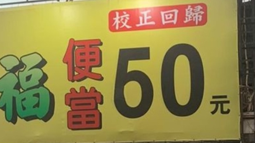 台南一家便當店,大大的招牌寫著便當的價格,上面的數字像是50元,仔細看又像是60元,但上頭打著校正回歸,網友拍下好奇,「校正回歸」是這樣用嗎,從50元調整為60元,怎麼不是變便宜?網友議論,有人覺得還是便宜,但有人認為「校正回歸」這四個字用的不恰當。