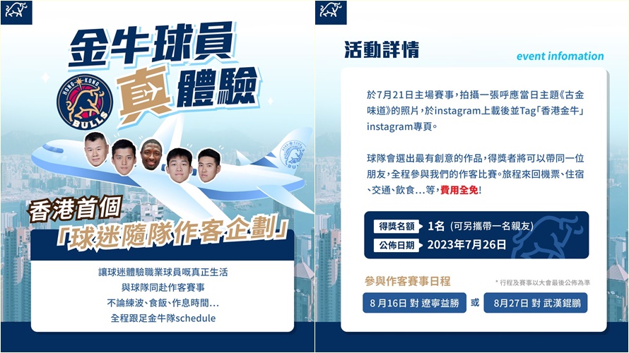 為了讓球迷有一個全新的看球體驗,香港金牛隊今季先後舉辦多個主題,包括邀請台灣超人氣啦啦隊「樂天女孩」到場表演、舉辦「Little Bulls Night 小金牛之夜」,全都好評如潮。金牛隊再接再勵,宣布推出香港首個「球迷隨隊作客企劃- 金牛『真』體驗」,選出一位幸運球迷隨隊出戰客場賽事。屆時這位球迷可以化身球隊的第20名球員,跟隨坎普、孫偉博、楊睿騏等明星球員練波、食飯、作息…等所有行程,親身感受職業球員的真正生活,機會難得!所有明晚入場的觀眾都有機會參加,只要他們當晚拍攝一張呼應當日主題《古金味道》的照片,並於instagram上載後並Tag 「香港金牛」,球隊會在當中選出最有創意的作品,得獎者可以帶同一位親友,免費體驗這種千金難求的難忘旅程。陣中港將梁兆華表示:「好期待這個計劃,一來可以與球迷接觸,二來可令球迷對我們的日常生活有更深了解。」兆華笑稱到時練習會負責督促這位球迷不要偷懶,好好感受一下他們平常的「辛勞」。