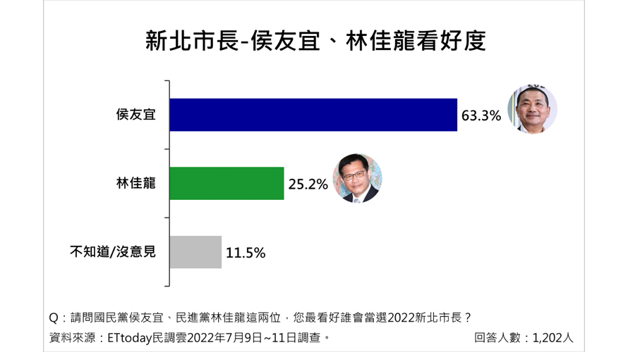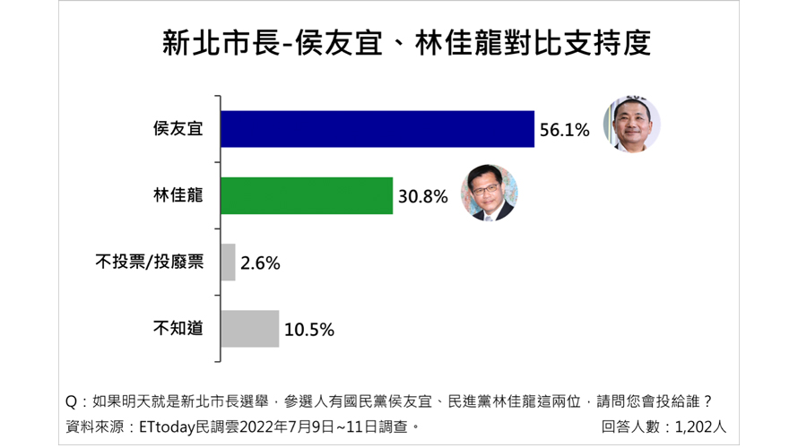 民進黨選對會日前拍板徵召前交通部長、無任所大使林佳龍參選2022新北市長選舉,而在藍營方面,現任新北市長侯友宜競選連任幾己確定,《ETtoday新聞雲》於7月9日至11日,針對20歲以上的新北市民進行「2022新北市長人選調查」,回收有效樣本數1,202份,抽樣誤差在95%信心水準下,為正負2.83%。
