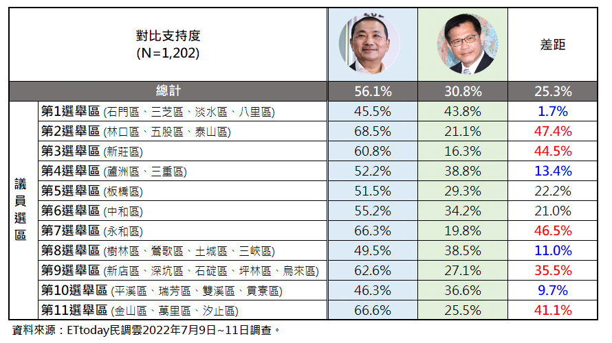 若由議員選區來看,第2選舉區(林口區、五股區、泰山區)、第3選舉區(新莊區)、第7選舉區(永和區)、第9選舉區(新店區、深坑區、石碇區、坪林區、烏來區)、第11選舉區(金山區、萬里區、汐止區)中,侯友宜的領先幅度均達三成五以上,為兩人支持度差距最大的五個選區;而在議員選區第1選舉區(石門區、三芝區、淡水區、八里區)、第4選舉區(蘆洲區、三重區)、第8選舉區(樹林區、鶯歌區、土城區、三峽區)、第10選舉區(平溪區、瑞芳區、雙溪區、貢寮區)中,侯友宜領先幅度均在一成五以下,為兩人支持度差距較小的選區。但因距離選舉還有一段時間,後續變化仍有待觀察。
