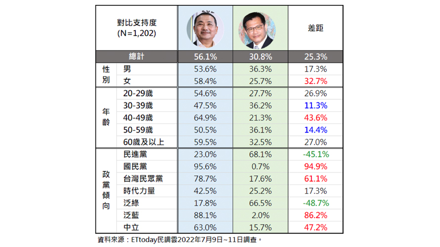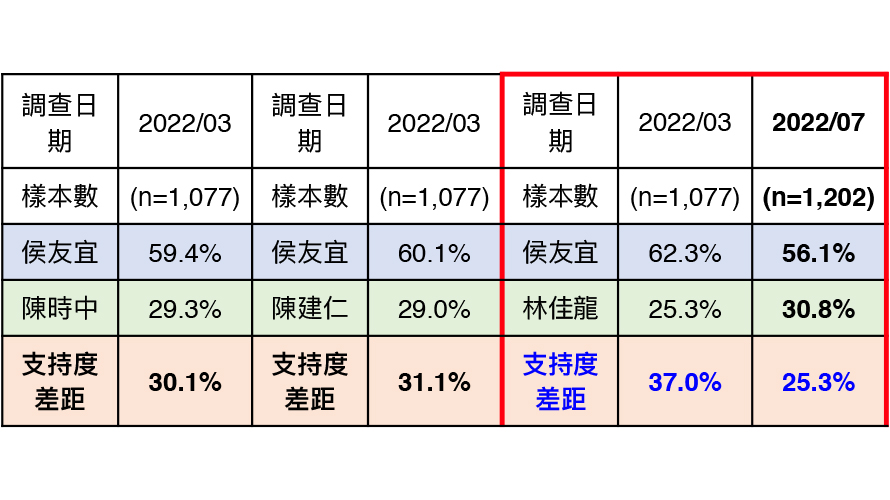 與《ETtoday新聞雲》前次調查(2022年3月)結果相比後發現,由於民進黨參選人已定案為林佳龍,在本次的調查中,綠營支持者已有逐漸開始凝聚的現象,林佳龍支持度由前次25.3%提升5.5%本次30.8%,獲得與前次調查中陳時中或陳建仁差不多的支持度;而侯友宜的支持度則由前次62.3%下滑6.2%至本次56.1%,儘管本次調查侯友宜仍為領先,但兩人支持度差距已拉近至25.3%。
