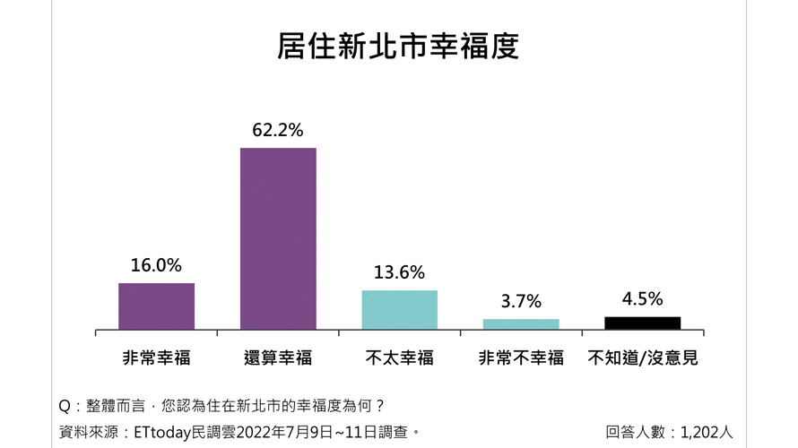 新北市民認為住在新北市的幸福度為78.2%(非常幸福16.0%、還算幸福62.2%);另有17.3%新北市民認為不幸福(非常不幸福3.7%、不太幸福13.6%)。