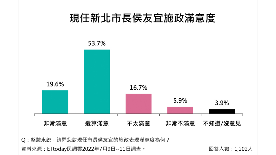73.3%新北市民對現任市長侯友宜的施政表現感到滿意(非常滿意19.6%、還算滿意53.7%);另有22.6%新北市民對侯友宜施政表現感到不滿意(非常不滿意5.9%、不太滿意16.7%)。