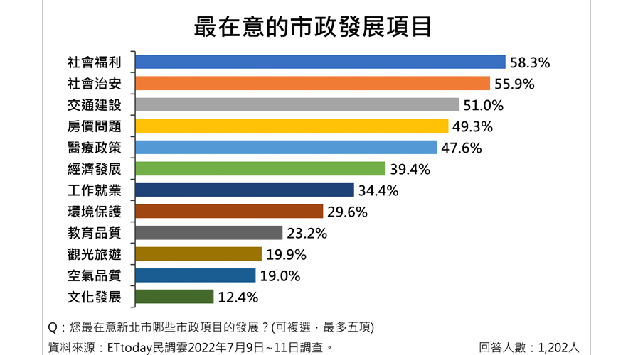 新北市民最在意的市政發展項目前五項依序為社會福利(58.3%)、社會治安(55.9%)、交通建設(51.0%)、房價問題(49.3%)、醫療政策(47.6%)。