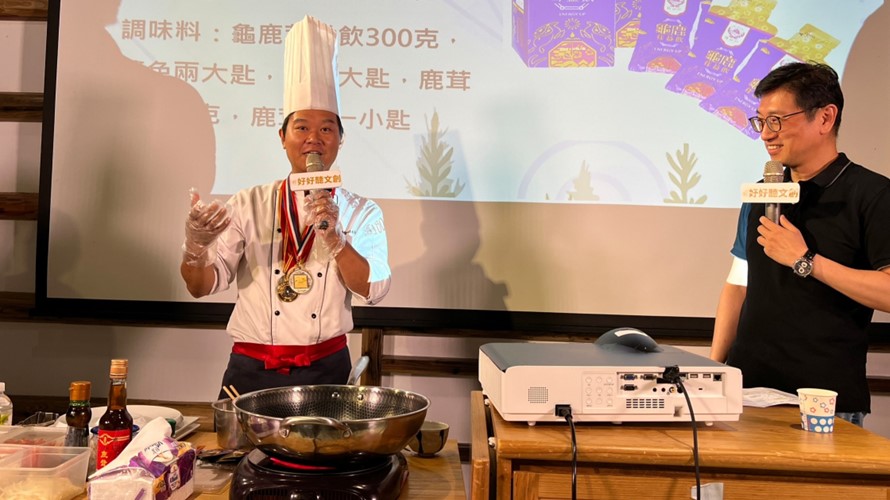 現場由台菜小天王溫國智主廚和東海大學高齡健康與運動科學學程系主任吳旻寰互動分享。溫國智主廚以「台菜小天王」的身份,介紹了鹿茸在夏季涼補好料理中的應用。吳旻寰則從健康管理的角度探討鹿茸對身體的益處。