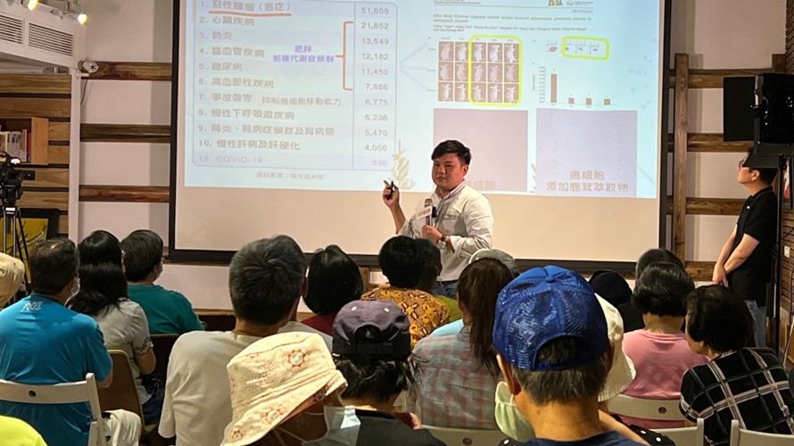 ▲東海大學高齡健康與運動科學學程系主任-吳旻寰(站立者)正在說明在醫學文獻記載鹿茸可以抗氧化抗發炎的內容。(好好聽文創提供)