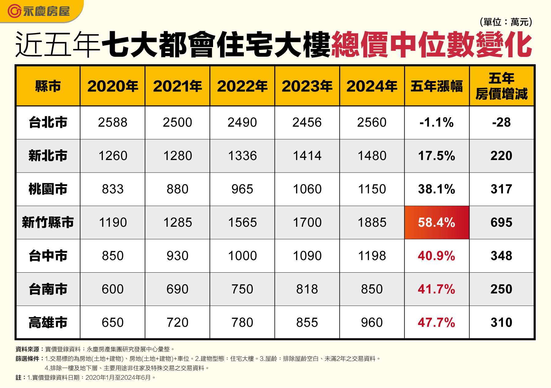 永慶房產集團統計七大都會區2020年至2024年之間各年度住宅大樓總價中位數變化,2020年之際尚有桃園市、台中市、台南市與高雄市四大都會區總價中位數落在1,000萬元內,但到了2024年,總價中位數還在1,000萬元內則僅存台南市與高雄市,房價明顯上漲。而新竹縣市住宅大樓五年間總價中位數漲幅達58.4%,七都中最強勁。