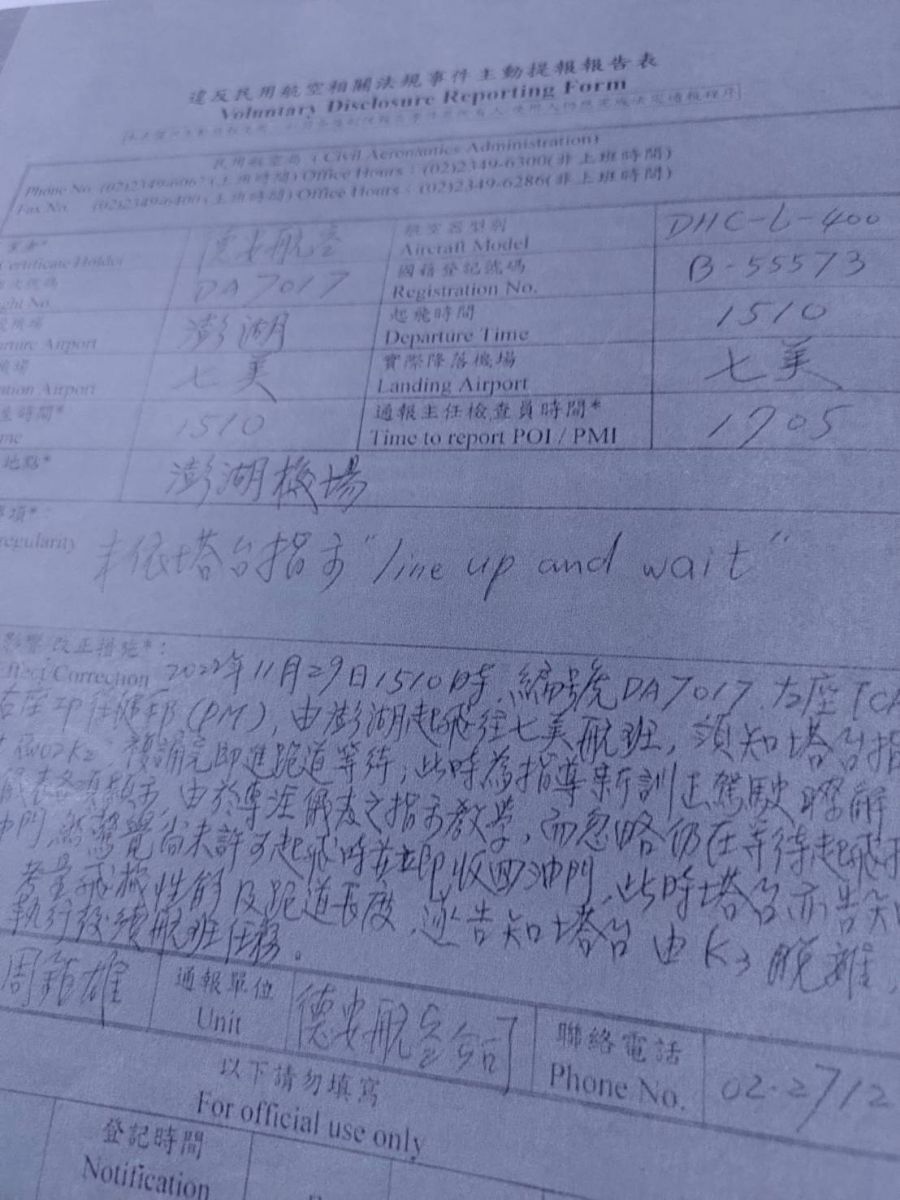 他質疑,這張由德安航空飛安督導周鉅雄填寫的通報表,很明顯將疑似違規事項欄由「未依許可起飛」偽填成「未依塔台指示line up and wait(進跑道等待)」,「這就是造假啊!事實上班機已經領到塔台指示進入跑道等待起飛許可,這樣通報的目的是要規避責任,想大事化小,飛安督導怎會不清楚其中的差別?報告前後矛盾他竟然還簽名?」