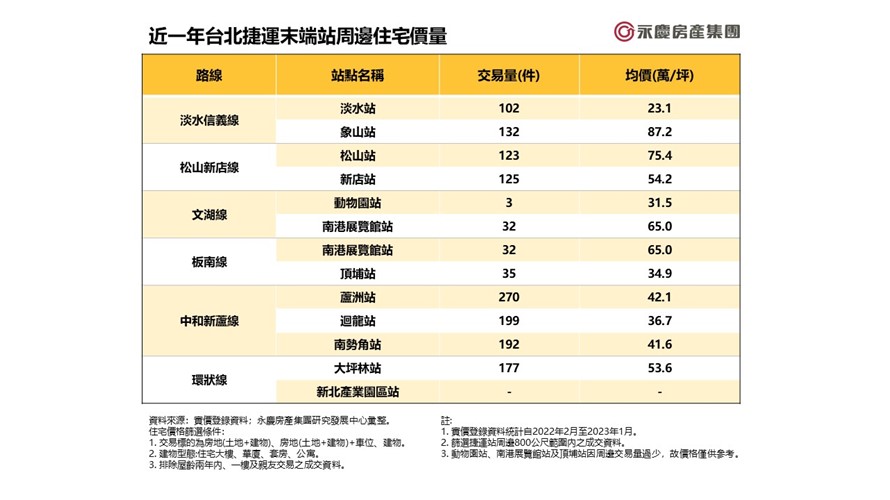 ▲表_近一年台北捷運末端站周邊住宅價量。(圖/永慶房屋提供)