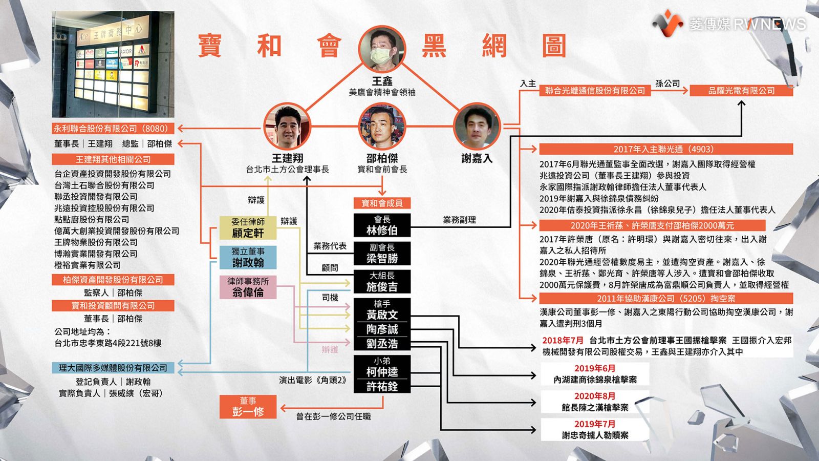 《菱傳媒》查詢政府公開資訊顯示,邵柏傑為柏傑資產開發公司監察人、寶和投資顧問公司董事長,且還擔任王建翔名下永利聯合公司的總監;此外,根據涉及館長槍擊案的寶和會長林修伯供述文指出,現任寶和會副會長梁智勝則是王建翔公司的業務代表,至於遭控犯下館長槍擊案的組長施俊吉則是掛名顧問。檢警說,由此可見王建翔與寶和會之間關係密切。