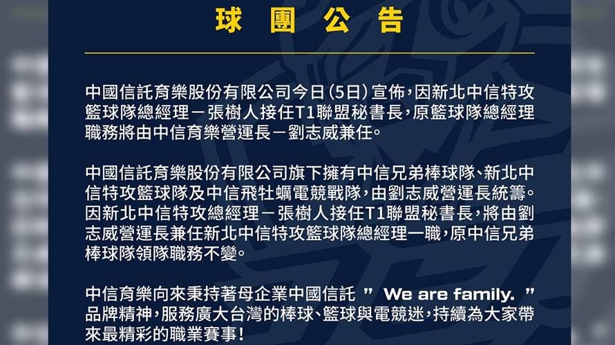 中國信託育樂股份有限公司5日宣佈,因新北中信特攻籃球隊總經理張樹人接任T1聯盟秘書長,原籃球隊總經理職務將由中信育樂營運長劉志威兼任。