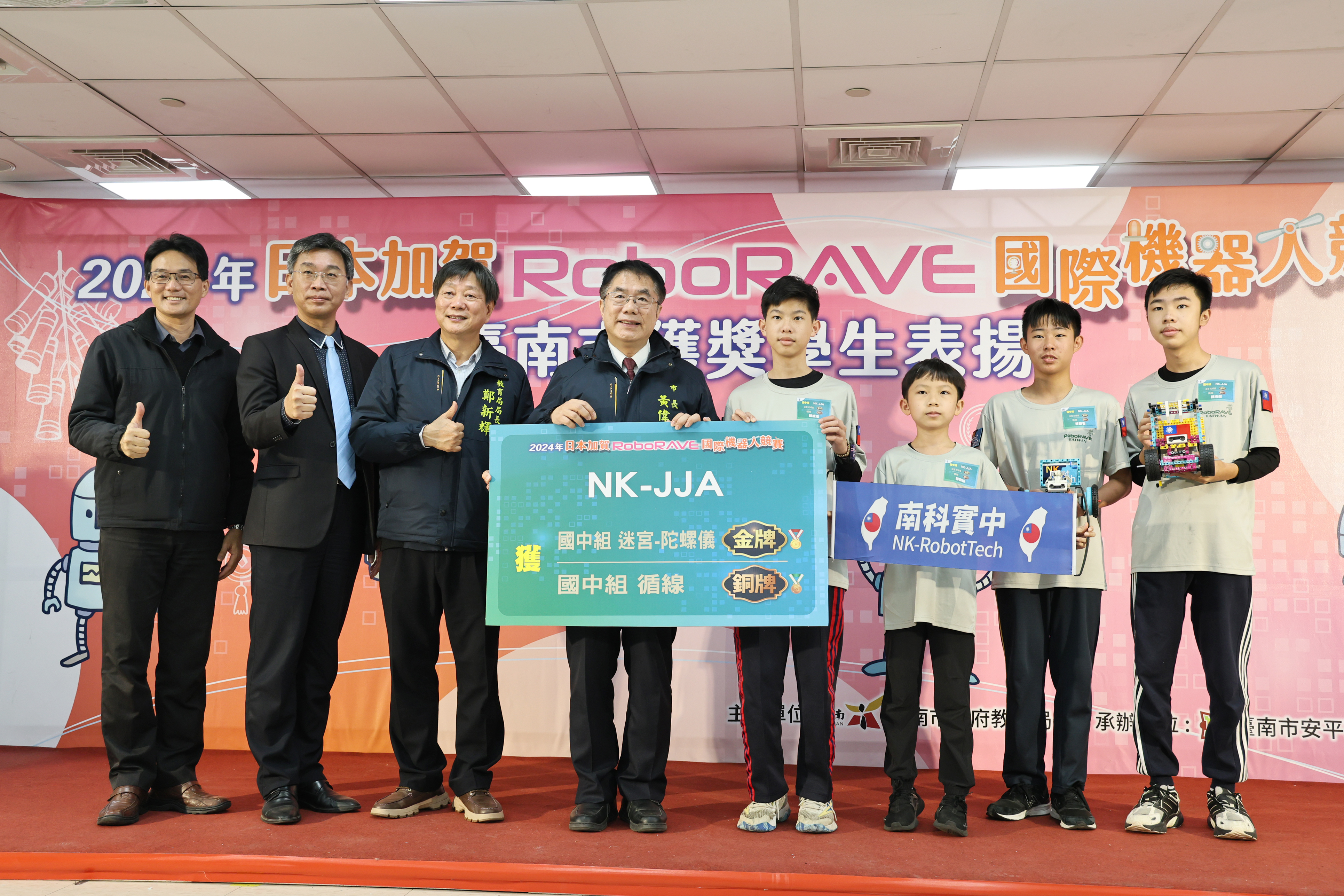 臺南市代表隊參加去(113)年11月參加在日本舉辦「RoboRAVE國際機器人大賽」,在強敵環伺下,榮獲28面獎牌,囊括總獎牌數近三分之二,成績優異。市長黃偉哲今(3)日親自表揚獲獎學生,對其卓越表現給予高度肯定,期待學子們努力不懈,未來成為科技業的頂尖人才,讓臺灣科技產業持續在世界舞台發光發熱。