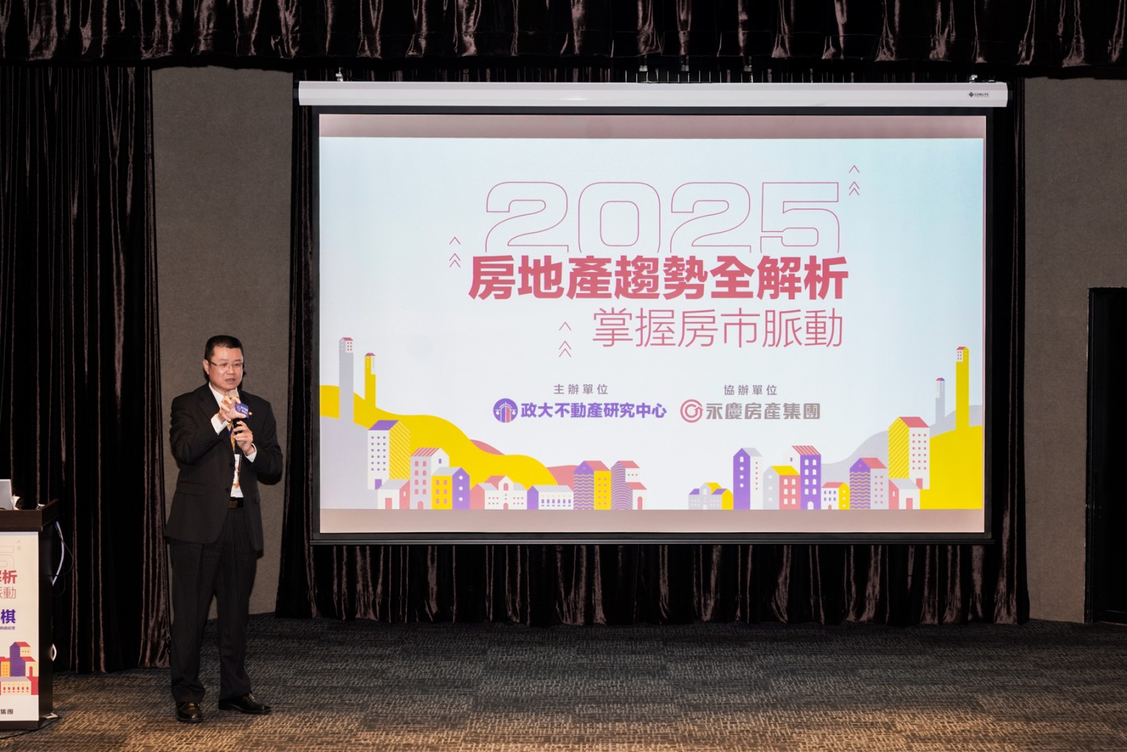 永慶房產集團業務總經理葉凌棋受邀主講政大不動產研究中心舉辦之「掌握房市脈動:2025房地產趨勢全解析」講座。(圖 / 永慶房屋提供)