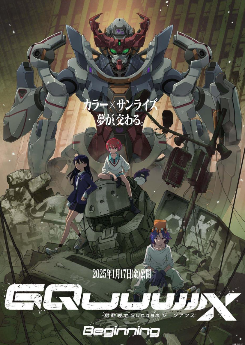 預計2月底上映的《機動戰士 Gundam GQuuuuuuX Beginning》是由「新世紀福音戰士」的製作公司khara與「機動戰士」系列的SUNRISE聯手推出的全新企劃。故事圍繞居住在太空殖民地的高中少女天手讓葉展開。當她遇到戰爭難民少女涅安後,被捲入非法MS決鬥競技「戰團對決」,駕駛著「GQuuuuuuX」參與激烈對抗。此時,一架被宇宙軍追捕的神秘鋼彈與駕駛員修司突然現身,讓葉的世界徹底改變。這架鋼彈與修司為何被追捕?他們的出現又隱藏著什麼真相?謎團將隨著劇情展開一一解開。