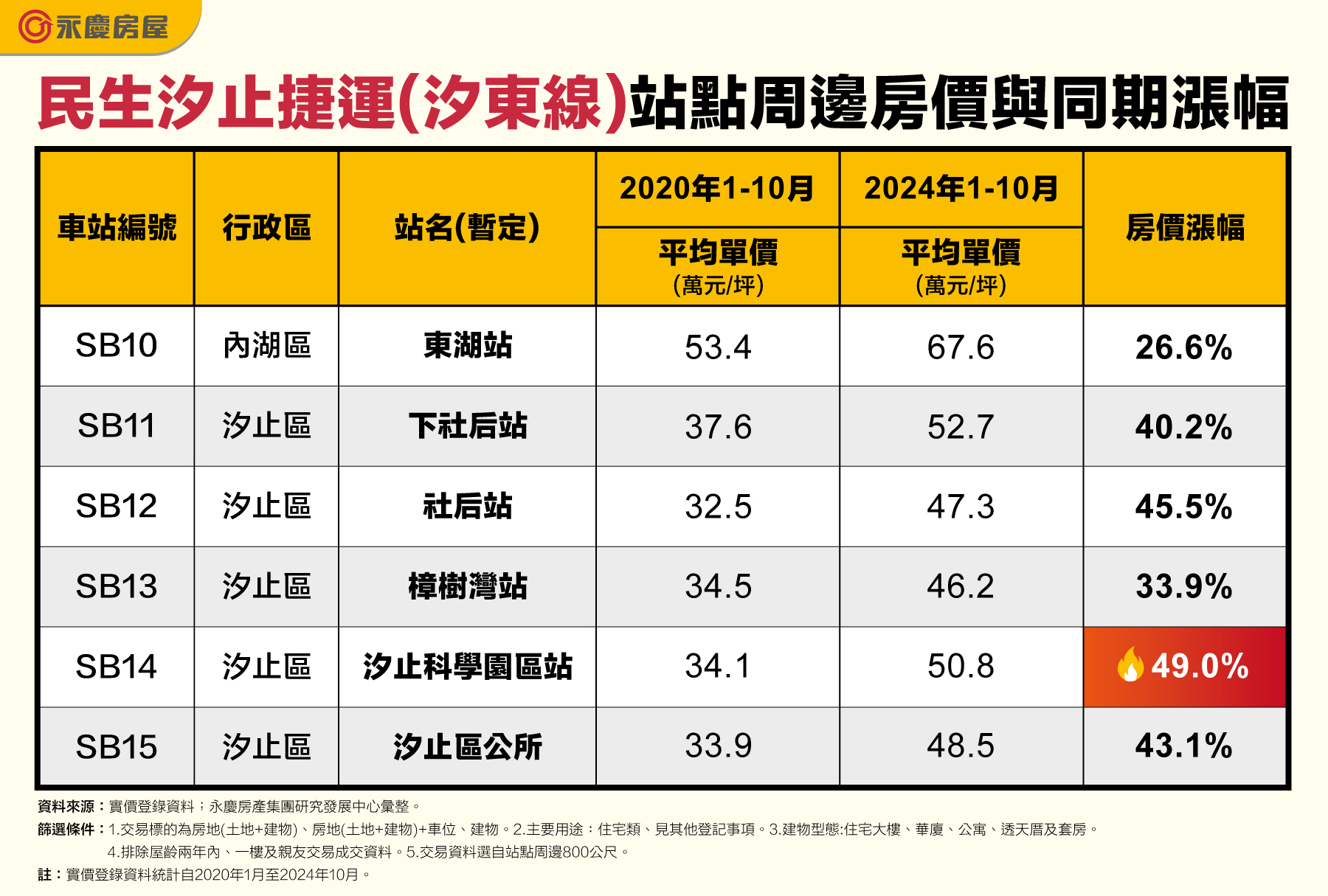 永慶房產集團統計即將開工的汐止民生線6大站點周邊房價與2020年的房價,其中SB14汐止科學園區站五年間房價漲幅高達49.0%。(圖 / 永慶房屋提供)