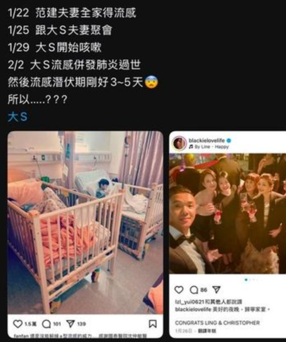在PTT八卦板,一篇名為「脆說黑人流感,還參加婚禮?」的文章引起廣泛關注,內容引用社群平台Threads上的討論,列出一份時間軸:1月22日,范瑋琪曾在IG發文,透露雙胞胎兒子因A型流感住院,並提到「全家都病懨懨的」。1月26日,黑范夫妻現身王偉忠女兒婚禮,與大S等賓客合照。1月29日,大S開始出現咳嗽等不適症狀。2月2日,她因流感併發肺炎不幸離世。Threads原PO更直指:「潛伏期剛好3~5天,所以…??」