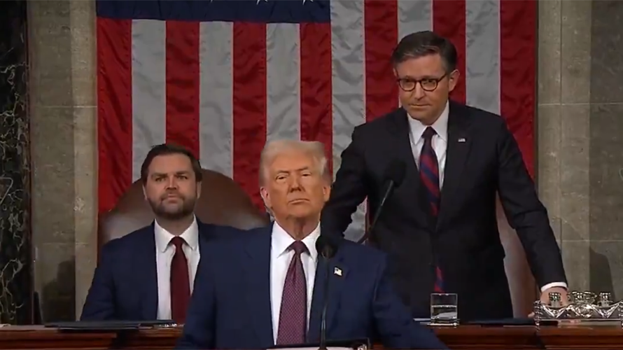美國總統川普4日發表國會演說,後為副手范斯(後左)和眾議院議長強生(後右)。(圖/摘自X)