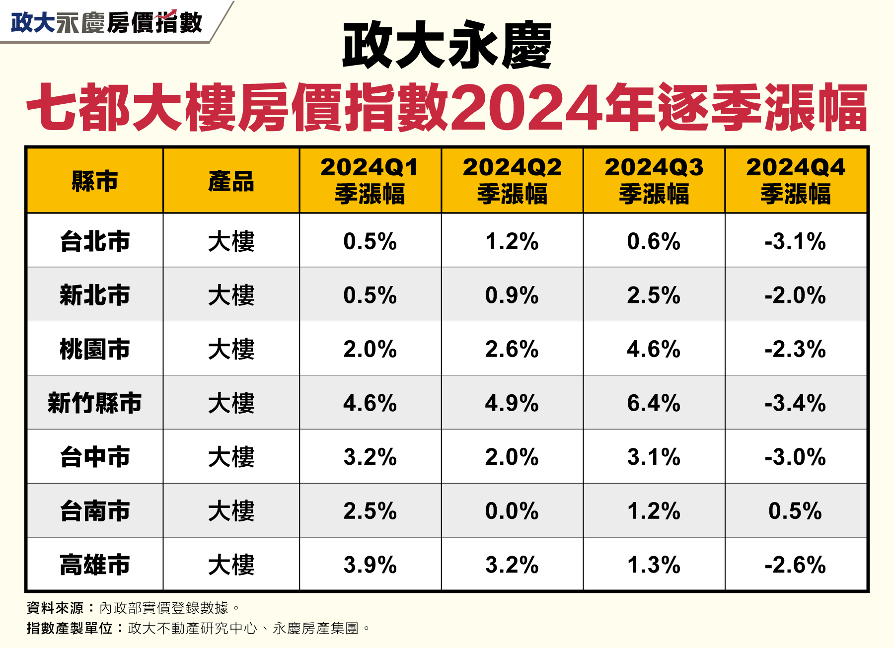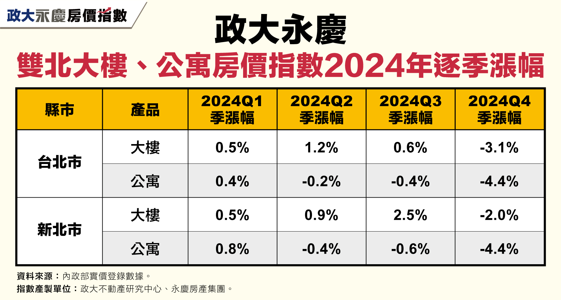 2024Q4房價開始反轉?台北、新竹、台中大樓房價指數跌幅逾3% 雙北公寓指數持續向下修正! 季跌幅超過4%