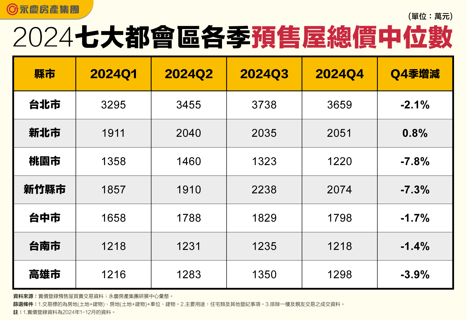 房貸緊縮+信用管制 2024Q4七都預售交易量季減逾4成! 2024Q4預售屋總價中位數見下降 桃園、新竹減幅逾7%!