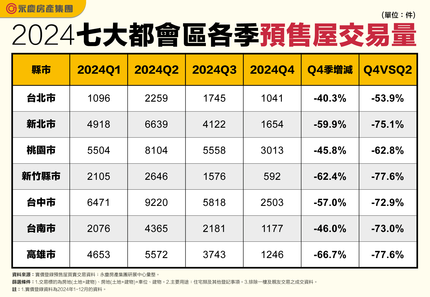 永慶房屋研展中心副理陳金萍表示,2024下半年房市傳出銀行房貸緊縮,以及央行實施第七波選擇性信用管制,抑制多房族的資金來源,使得投資客逐漸退場。再加上央行房市政策成功扭轉民眾對於房價持續上漲的預期心理,也讓房市緩步降溫。造成2024Q4七大都會區預售市場的交易量明顯驟減,其中又以過去幾年預售市場蓬勃的中南部縣市量縮最為明顯。