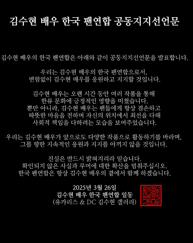 此外,韓國粉絲聯盟也發表了聯合聲明,公開表達對金秀賢的支持。聲明中提到:「作為金秀賢演員的韓國粉絲聯合,我們將一如既往地支持並應援金秀賢演員。金秀賢演員長期以來透過多部作品,對韓流文化產生正面的影響,始終以謙遜且溫暖的心對待粉絲。期盼金秀賢今後能透過更多優秀作品持續活動,我們堅信,真相終將大白。」