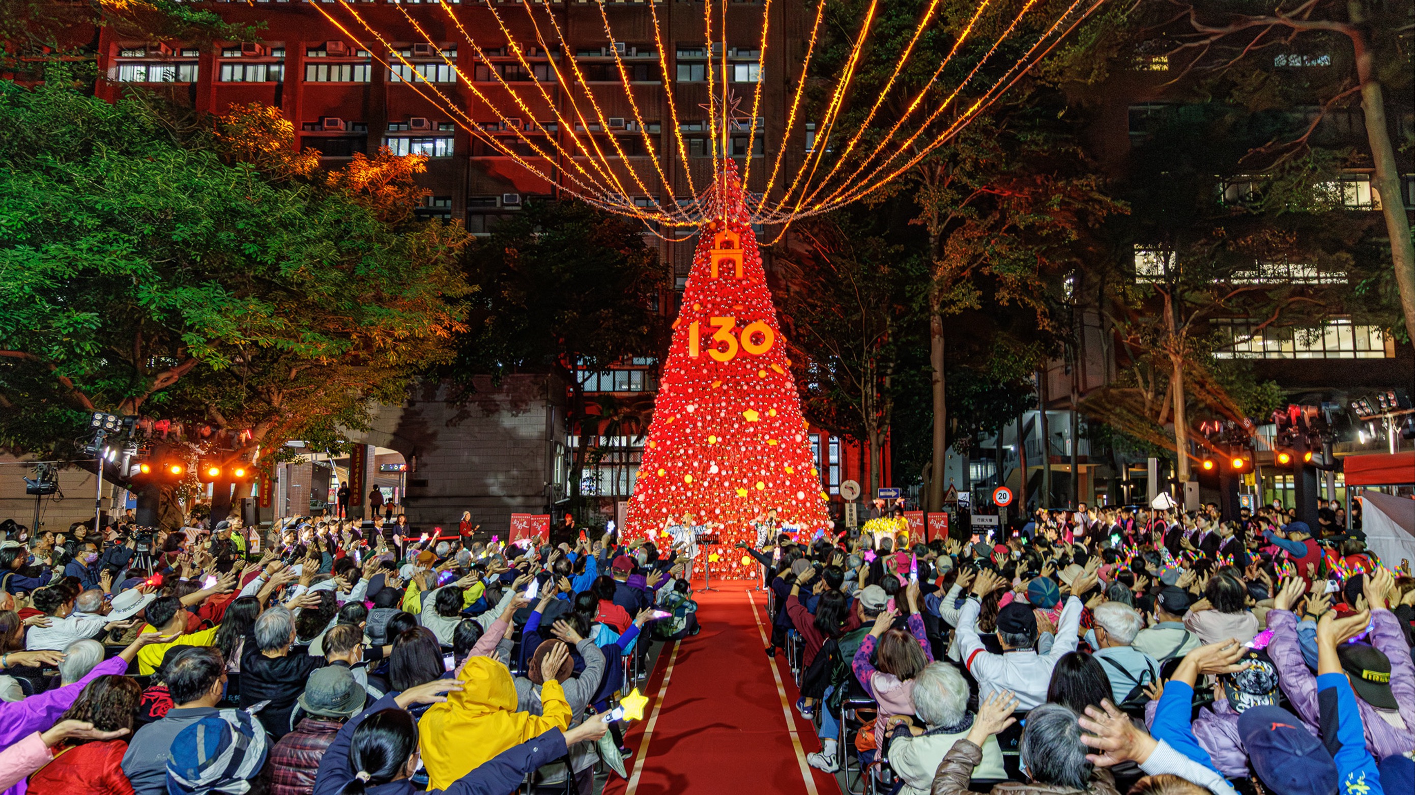 你看過全紅的聖誕樹嗎?國北教大於27日舉辦「130向前走」校慶點燈祈福典禮,是國北教大及校友總會、億光文化基金會主辦,結合「雙春金蛇年」意涵,用5000多顆金銀紅聖誕球妝點,在絢麗天幕光影折射的璀璨燈海下展開,吸引上千師生及各界貴賓同來祝賀,成為歲末最夯最飆的浪漫風情!
