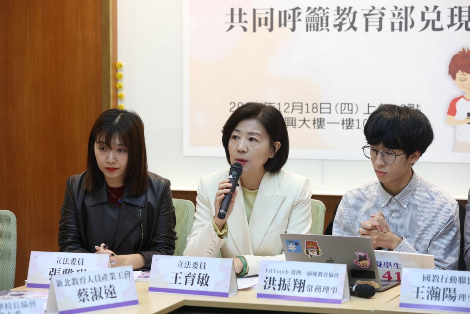 ▲立法委員王育敏要求教育部不能再以模糊指引敷衍,務必兌現承諾。(圖/國教行動聯盟 × EdYouth 臺灣一滴優教育協會提供)