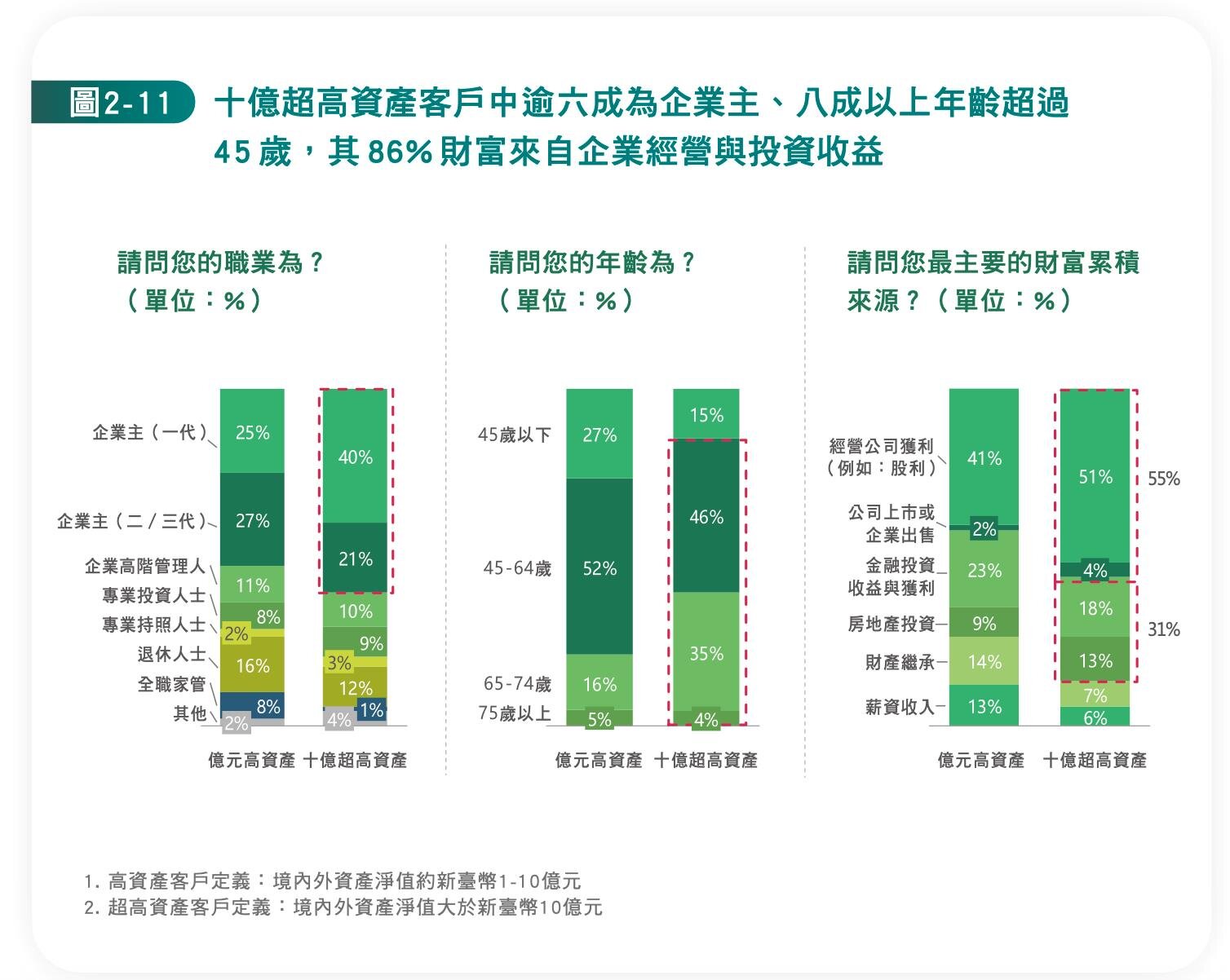 「十億級」超高資產客群的人數則預計從2025年的0.8萬人,以年均7%成長至2029年的1.1萬人,增速遠高於整體高資產客群。十億級超高資產客戶中逾六成為企業主,主要的財富累積來源依序為51%經營公司獲利、18%金融投資收益,以及13%來自房地產投資;值得留意的是,相較「億元以上」高資產客群房地產投資佔比為9%,「十億級」的超高資產客群更看重透過房地產累積財富。