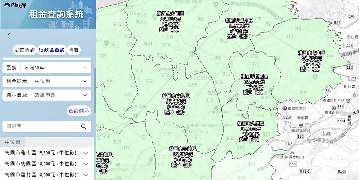 如果是以行政區來查詢,比如點選桃園市、整戶(層)住家、屋齡未滿30年,租金顯示為中位數,顯示層級點選鄉鎮市區,圖資系統就會立即顯現桃園市各行政區上面租屋條件的租金中位數;比如桃園區屋齡未滿30年的整戶(層)住家,租金中位數為18,000元,八德區則是17,000元。
