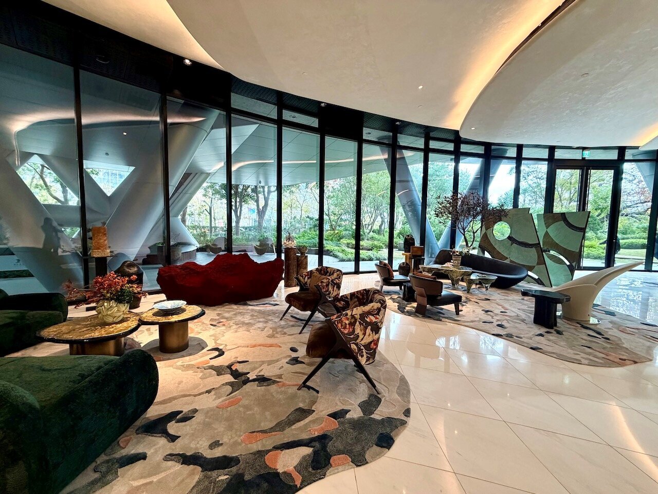 「陶朱隱園」1樓大廳有接待會所的氣派感,可步行繞一圈欣賞窗外生態庭園。圖/好房網News記者蔡佩蓉攝影