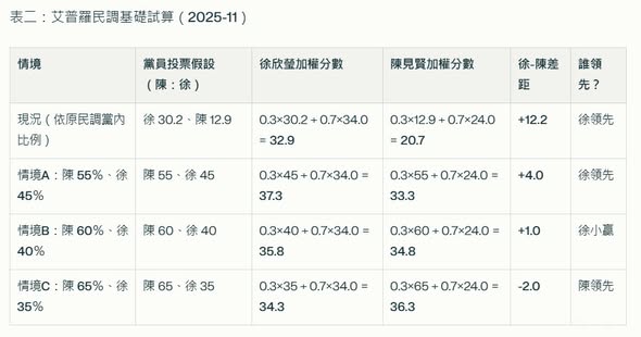 這說明在越新的民調結構裡(公信力),徐在對外民調的優勢較小(只贏陳 5.8 個百分點),因此陳在黨內投票的「翻盤門檻」相對較低;而在較早期的艾普羅民調裡,徐對外優勢更大(贏陳約 10 個百分點),陳需要更高的黨內票才能追平。
