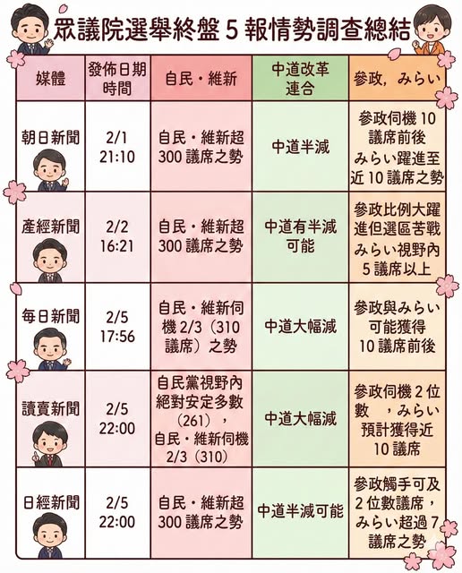 從五大報整理出的選情來看,自民・維新聯盟合計有望跨越三百席,中道改革聯合被普遍預期將面臨「席次腰斬」甚至「大幅減少」,原本寄望於政黨輪替與權力均衡的想像暫時破滅。在野勢力不但無法形成可替代的執政聯盟,反而持續分裂成多個中小政黨,只能在區區數十席之間內耗。