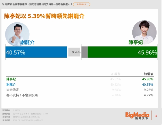 這份3月6日公布的民調結果是,民進黨的陳亭妃支持度45.96%,國民黨推2022年小輸黃偉哲的謝龍介捲土重來,支持度有40.57%,落後陳亭妃5.39個百分點。
