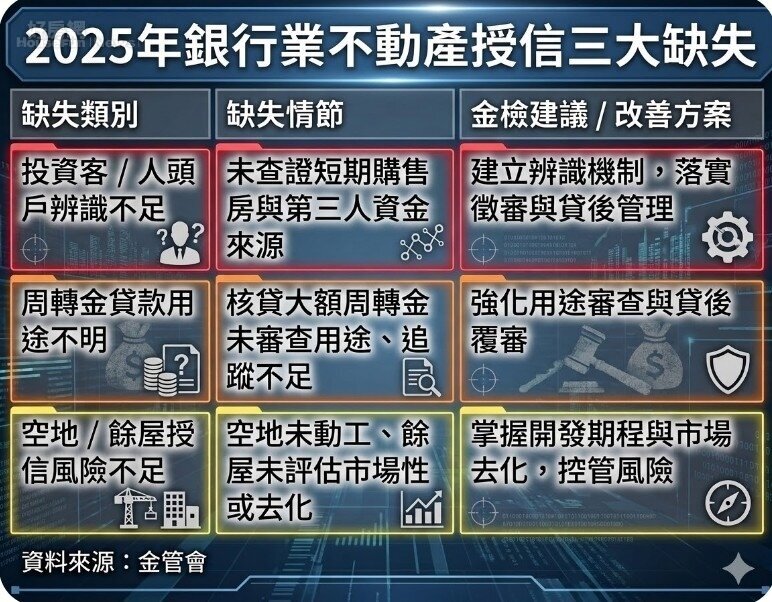 金管會的2025年下半年金檢缺失報告,涵蓋金控、銀行等12個業別,聚焦防詐、洗錢、消費者保護、資安與不動產授信四大面向,其中以不動產授信缺失最令市場震驚,檢查局副局長郭文龍指出,針對不動產授信的缺失主要集中在以下三大核心問題: