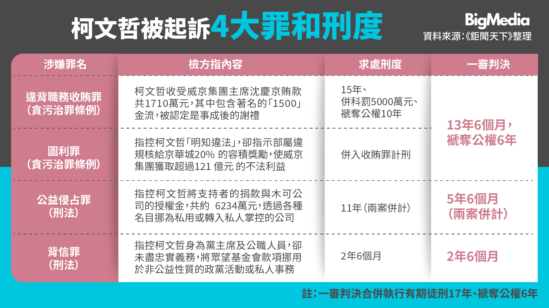 台北地院合議庭下午宣判,其中政治獻金部分,柯文哲依違背職務收賄罪判13年6個月、2件公益侵占罪各2年與3年6月、背信罪2年半,合併判處應執行17年有期徒刑,褫奪公權6年,可上訴。
