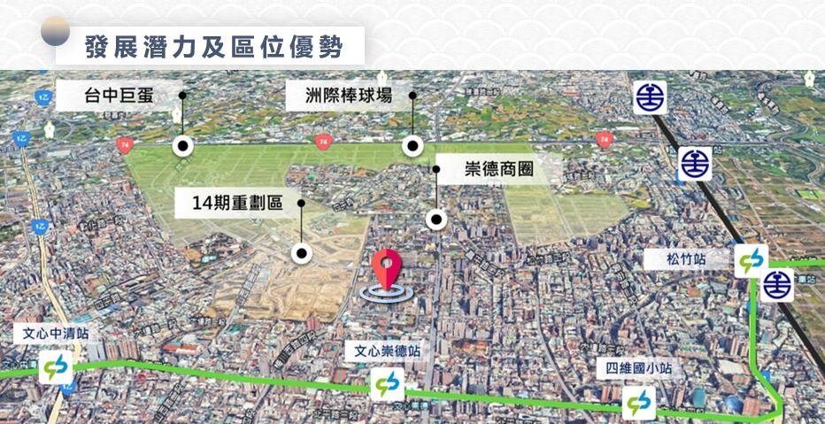 經發局表示,此案基地坐落北屯核心發展區域,周邊發展條件優越。十四期重劃區為台中近40年最大規模開發案,洲際棒球場、漢神洲際購物中心及台中巨蛋等重大建設陸續到位,帶動區域整體發展能量;基地鄰近水湳生態公園與崇德路商圈,周邊聚集高密度住宅與優質學區,包括馬禮遜美國學校與衛道中學,消費人口穩定成長。