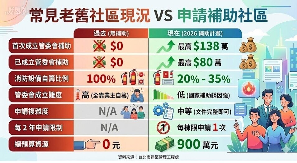 你家是民國92年前蓋的老公寓嗎?住在台北市超過20年的建物,每次看到樓梯髒污、水塔鏽蝕、消防設備老化,就開始苦惱修繕費用誰來出?現在台北市政府幫你解決這個痛點,台北市建築管理工程處推出「2026年度公寓大廈共用部分維護修繕費用補助計畫」,祭出900萬元預算、最高補助138萬元,鼓勵6樓以上老舊建物成立管委會並進行修繕,不只是補助,更是一場時間搶奪戰,申請分兩階段,第一階段從6月1日至30日,優先權給「首次成立管委會」的社區,,而且一定要注意2大「隱形門檻」資格,