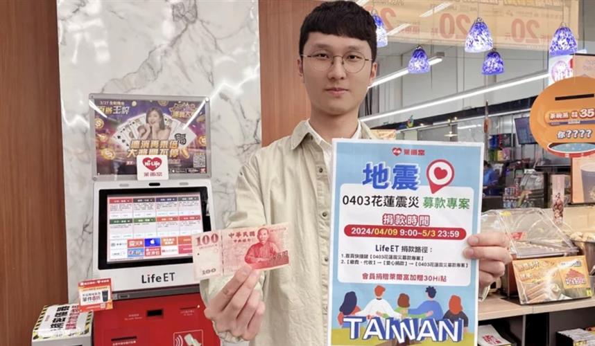 響應「0403花蓮震災募款專案」,萊爾富會員到Life-ET機台捐款再送30 Hi點,募款將持續到5月3日。(圖/萊爾富提供)