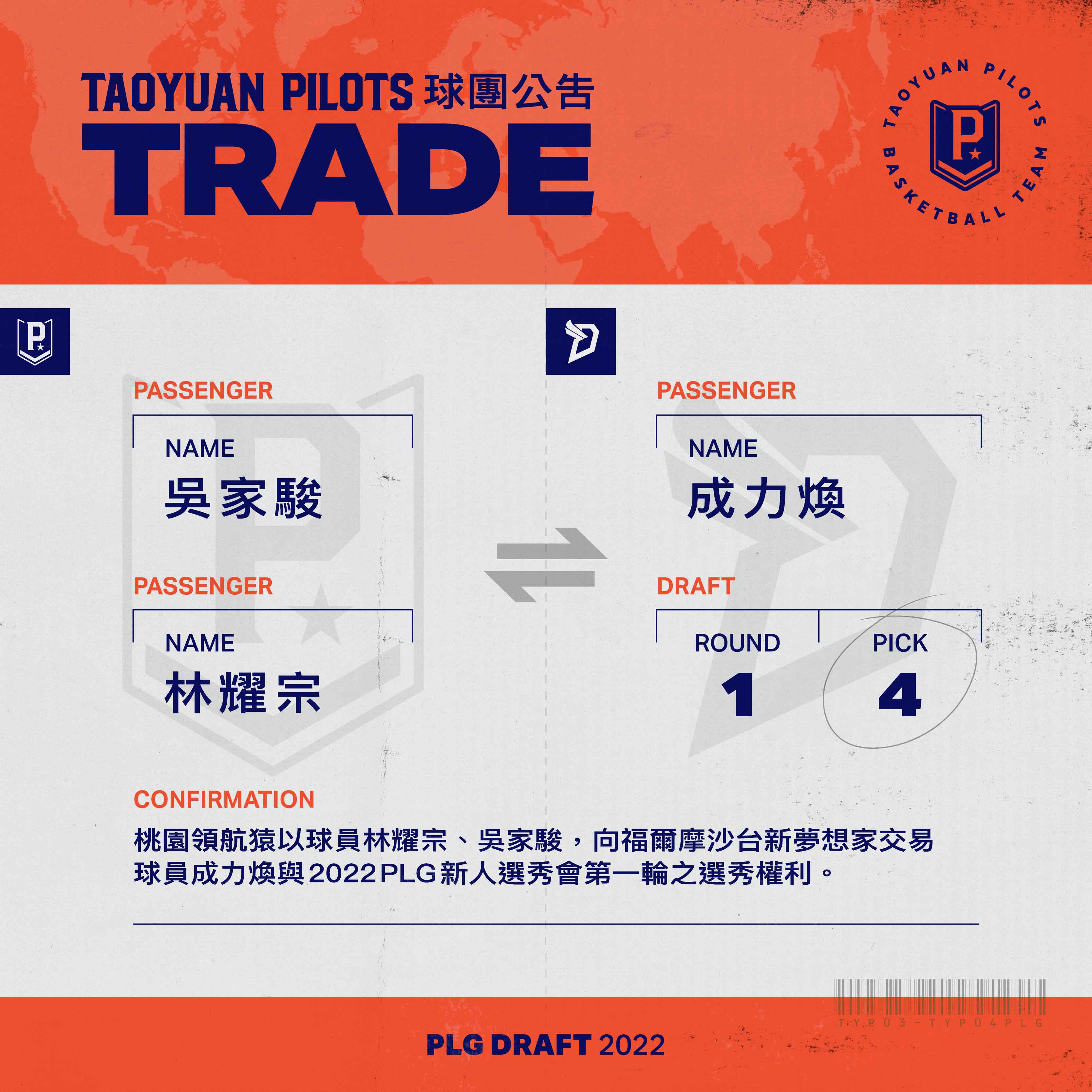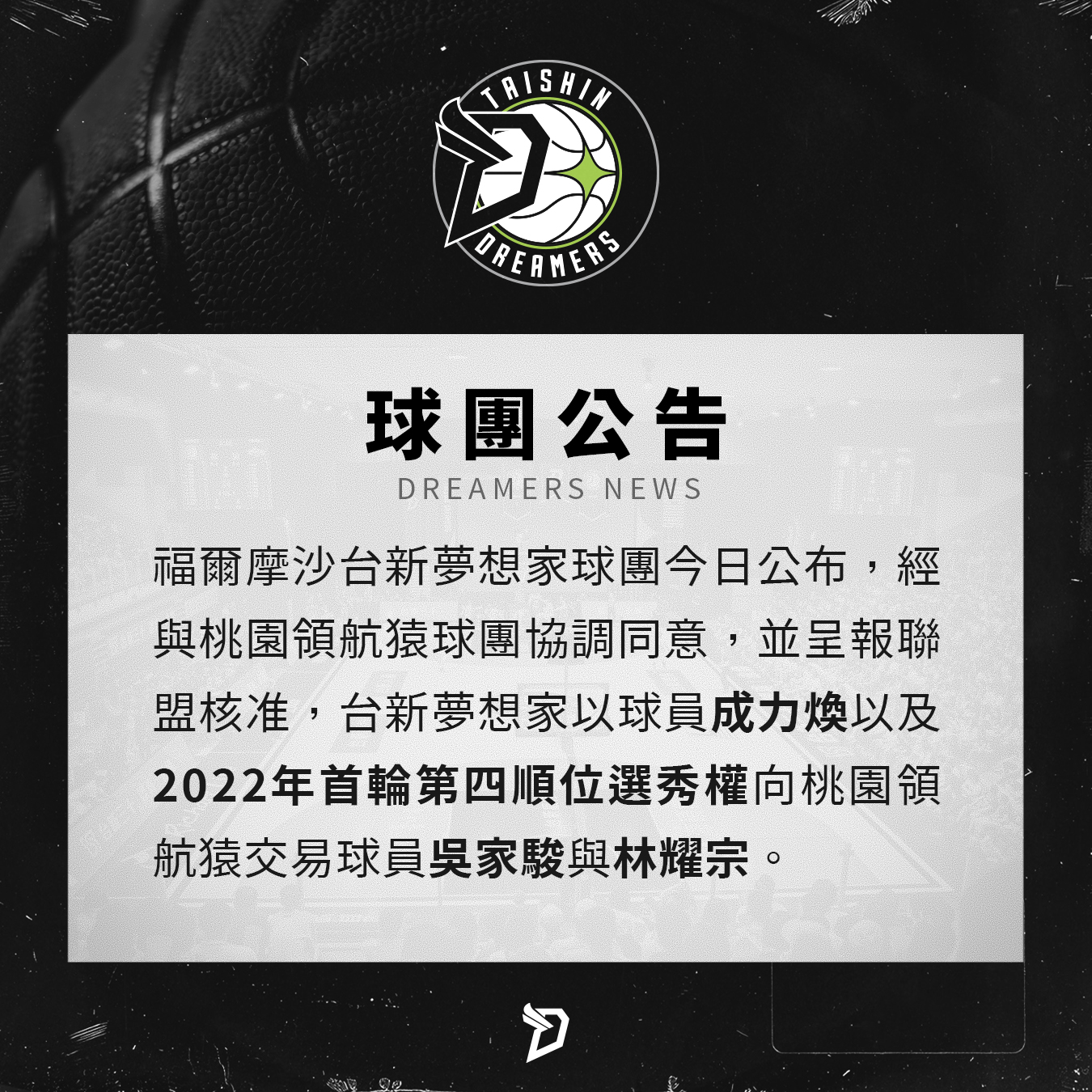 福爾摩沙台新夢想家與桃園領航猿球團今(14)宣佈,兩球團協調同意並呈報聯盟核准,台新夢想家以球員成力煥以及2022年PLG選秀會首輪第四順位選秀權,向桃園領航猿交易球員吳家駿與林耀宗。