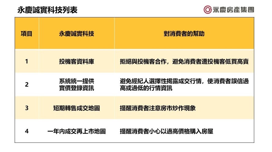 ▲永慶房屋利用科技優勢,推出諸多「誠實科技」,幫助消費者免於遭到投機客坑殺,保護消費者權益。(圖/永慶房屋提供)